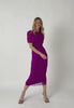 Vestido de tul a la caja con cortes verticales y piza drapeada que envuelve los hombros. Base de punto.