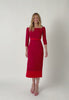 Vestido realizado en crepé con escote bardot y manga francesa. Franja en el bajo que combina en color con el cinturón en el mismo tejido.
