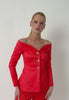 Top realizado en un tafetán con elastano. Escote bardot con forma curba que cierra en el centro del cuerpo con botones decorativos.