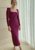 Vestido midi realizado en crepé elástico con escote cuadrado y hombros pronunciados. Cortes verticales con pespuntes decorativos que lo acentúan.
