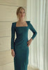 Vestido midi realizado en crepé elástico con escote cuadrado y hombros pronunciados. Cortes verticales con pespuntes decorativos que lo acentúan.