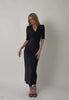 Vestido de punto con manga corta y hombros marcados. Cuerpo cruzado que anuda en la parte trasera o delantera. Falda recta.